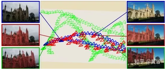 如图是PoseNet的结果展示。绿色是训练示例,蓝色是测试示例和红色显示姿势预测