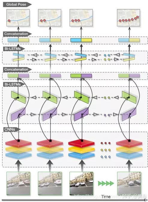 如图是VidLoc的架构模型。CNN部分的目标是从输入图像中提取相关的特征,这些特征可用于预测图像的全局姿态。CNN由堆叠的卷积和池化层构成,对输入图像操作。这里主要处理时间顺序的多个图像,采用VidLoc CNN的GoogleNet架构,其实只使用GoogleNet的卷积层和池化层,并删除所有全连接层。