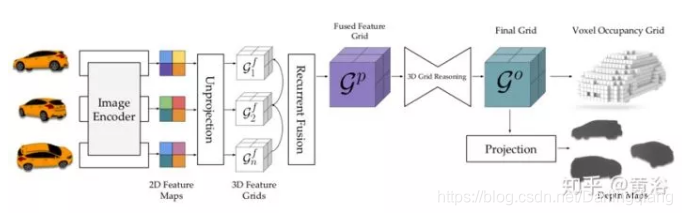 然后,以递归方式匹配这些网格G以产生融合网格Gp,这里采用的是门控递归单元(GRU)模型。接着,通过3D CNN将其转换为Go。最后,LSM可以产生两种输出 - 从Go解码的体素占有网格(体素 LSM)或在投影操作之后解码的每视角的深度图(深度LSM)。