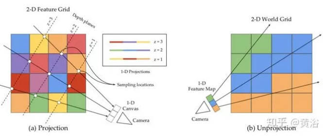 如图给出1D图和2D网格之间的投影和反投影示意图。(a)投影操作沿光线以等间隔z值采样值到1D图像中。在z平面的采样特征堆叠成通道形成投影的特征图。(b)反投影操作从特征图(1-D)中获取特征,并沿光线放置在相应与之相交的网格块。