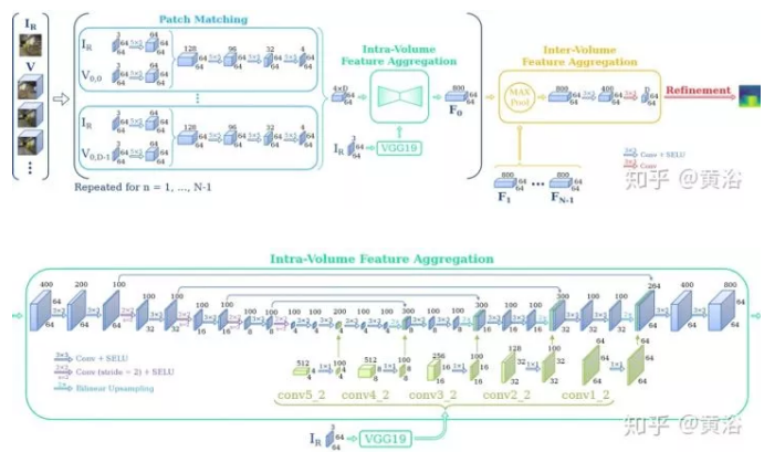 下面两个图分别显示带超参数的DeepMVS体系结构。整个网络分三部分:1)补丁匹配(patch matching)网络,2)容积内特征聚合(intra volume feature aggregation)网络,3)容积之间特征聚合(inter volume feature aggregation)网络。除了最后一层,网络中所有卷积层都跟着一个可缩放指数线性单元(Scaled Exponential Linear Unit ,SELU)层。