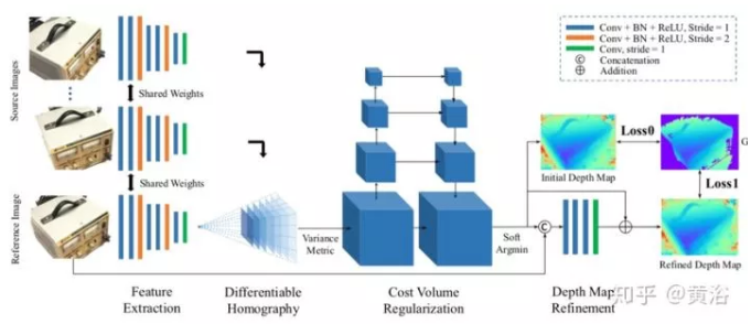 如图是MVSNet网络设计图。输入图像通过2D特征提取网络和可微分单应性变形生成成本容积。从正则化的概率容积回归最终的深度图输出,并且用参考图像细化。