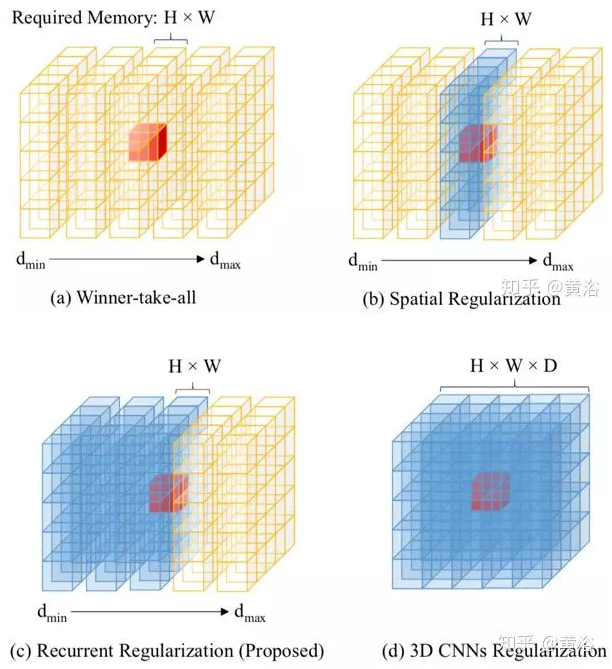下图比较了不同正则化方案的策略。一次性全局正则化成本容积C的替代方案是串行地沿深度方向处理成本容积。最简单的顺序方法是赢家通吃(WTA)的平面扫描(plane sweeping)立体视觉法,它粗略地用较好的值替换逐像素深度值,因此受到噪声的影响(如图(a))。为此,成本聚合法过滤不同深度的匹配成本容积C(d)(如图(b)),以便收集每个成本估算的空间上下文信息。遵循串行处理的思想,这里采用一种基于卷积GRU的更强大的递归正则化方案。该方法能够在深度方向上收集空间和单向上下文信息(如图(c)),与全空间3D CNN(如图(d))相比,这实现了差不多的正则化结果,但是 运行时内存更加有效。