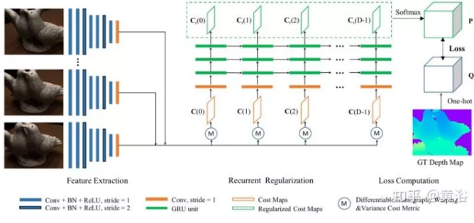 下图是R-MVSNet的框图介绍。从输入图像中提取深度图像特征,然后将其变形到参考相机坐标系的前向平行平面。在不同深度处计算成本图并由卷积GRU串行地正则化处理。网络被训练为具有交叉熵(cross-entropy)损失的分类问题。