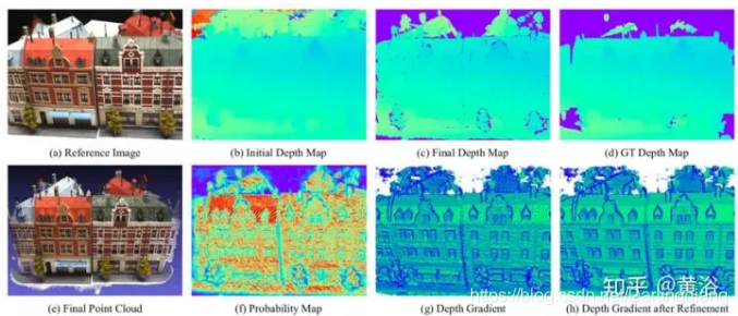 如图是R-MVSNet的重建流水线直观图:(a)DTU图像;(b)来自网络的初始深度图;(c)最终深度图估计;(d)基础事实深度图;(e)输出点云;(f)深度图滤波的概率估计图;(g)初始深度图的梯度图;(h)细化后的梯度图。
