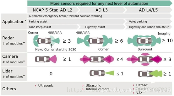 在环境感知中,每一种传感器都有独特的优势和弱点。例如,毫米波雷达不受天气影响可全天候全天时工作,但分辨率不高,不能区分人和物;而摄像头有更高的分辨率,能够感知颜色,但受强光影响较大;激光雷达则能够提供三维尺度感知信息,对环境的重构能力强,但受天气影响大。传感器各有优劣,难以互相替代,未来要实现自动驾驶,是一定需要多种传感器相互配合共同构成汽车的感知系统。如图7,随着自动驾驶从L2级朝L5级自动驾驶发展,集成在汽车上传感器数量和种类不断增加,只有这样才能够保证信息获取充分且有冗余,才能达到OEM主机厂所需的安全标准。