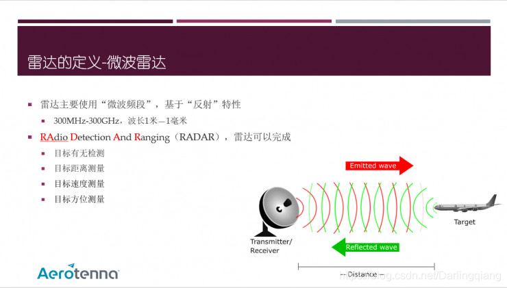 雷达(Radar,radio detecting and ranging),无线电探测和测距。雷达的基本任务是发射电磁波对目标进行照射并接收其回波,由此获得目标至电磁波发射点的探测感兴趣的距离、方向、速度等状态参数。按辐射种类可分为:脉冲雷达和连续波雷(FMCW)。