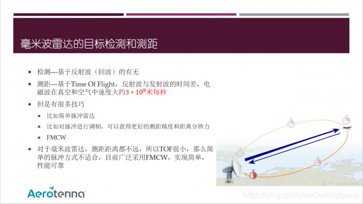 测距也简单,都是基于TOF原理(毫米波和大多数微波雷达一样,有波束的概念,也就是发射出去的电磁波是一个锥状的波束,而不像激光是一条线。这是因为这个波段的天线,主要以电磁辐射,而不是光粒子发射为主要方法。这一点,雷达和超声是一样,这个波束的方式,导致它优缺点。优点,可靠,因为反射面大,缺点,就是分辨力不高。),但是我们说电磁波的传播速度是光速,所以这个带来了一定的挑战。刚才我们说毫米波雷达作用距离都不太远,比如我们说汽车或者无人机,那么探测距离就很近,回波和发射波间隔就非常短,所以一般并不太适合使用简单的发射脉冲方式,所以现在主要是用FMCW((Frequency Modulated Continuous Wave),即调频的连续波信号)方式较多。