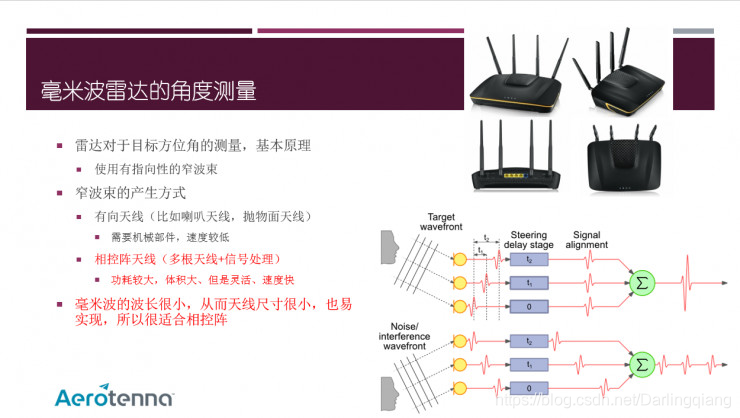 角度测量:最后一个,是毫米波雷达的侧向,雷达对目标方位的探测主要基于一种方法,就是使用较窄的波束。因为当目标出现在波束里,我们一般没有办法判断目标具体在这个波束内部的哪个方向,所以我们必须把波束做窄,当然能和激光一样最好,但是这个很难。那么把波束做窄,有几种方法,一种使用有向天线,比如喇叭天线或者透镜天线。还有一种方法,就是使用多根天线+阵列信号处理的方法。对于毫米波来讲,由于波长很短,所以我们做很多根天线的代价就很小(这个代价指价格、尺寸),所以毫米波雷达大量使用阵列天线的方式来构成窄波束,能多窄呢?比如3度,5度这样,是汽车常用的。当然这个和激光还不能比,但是已经很好了。