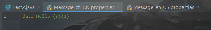 import java.util.ResourceBundle;public class Test1 {public static void main(String[]args){//访问的时候不用加上后缀,因为默认找到的后缀就是“*.properties”ResourceBundle resourceBundle=ResourceBundle.getBundle("Project.Study.ResourceBundleClass.test1_data");System.out.println(MessageFormat.format(resourceBundle.getString("data"),"World","!!!"));//设置两个占位符的内容}