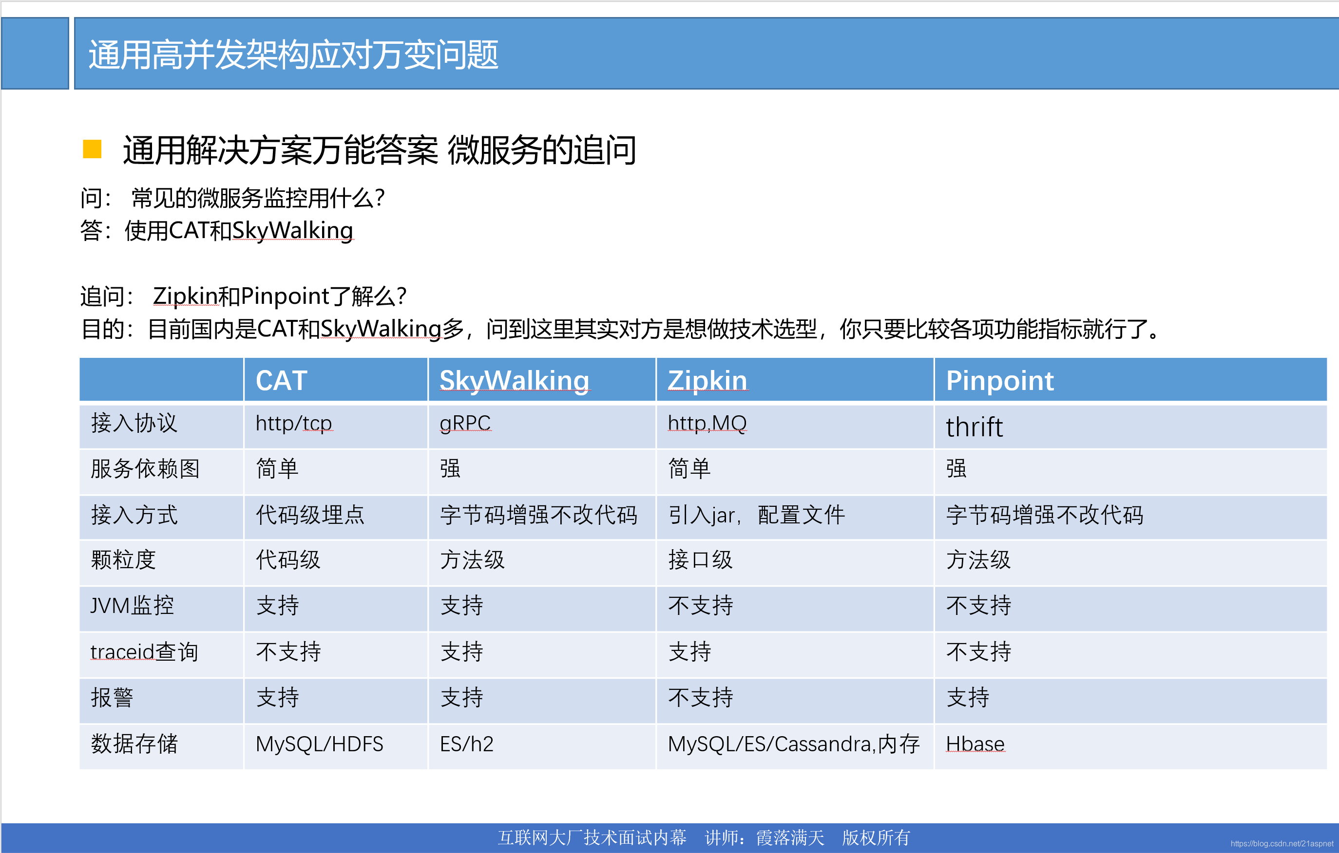 不仅仅是高频面试题 ,面试肯定会遇到没有见过的场景面试题,需要出解决方案,对于这一类问题准备了一套高并发的技术架构,使用这套架构就可以很好的应对各种新问题。下面是其中一个小片段分享,关于微服务监控方案的技术选型。