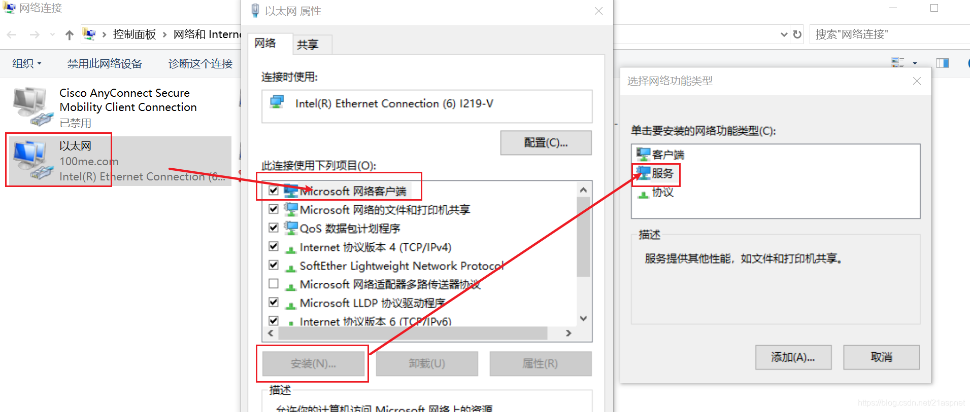选择“服务”,点击【添加】按钮,弹出“选择网络服务”对话框,点击【从磁盘安装】按钮,