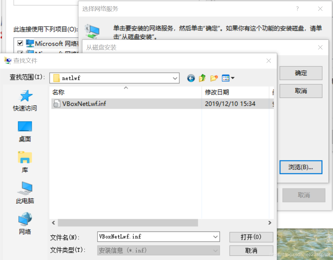 选择“C:\Program Files\Oracle\VirtualBox\drivers\network\netlwf\VBoxNetLwf.inf”,安装该驱动即可。