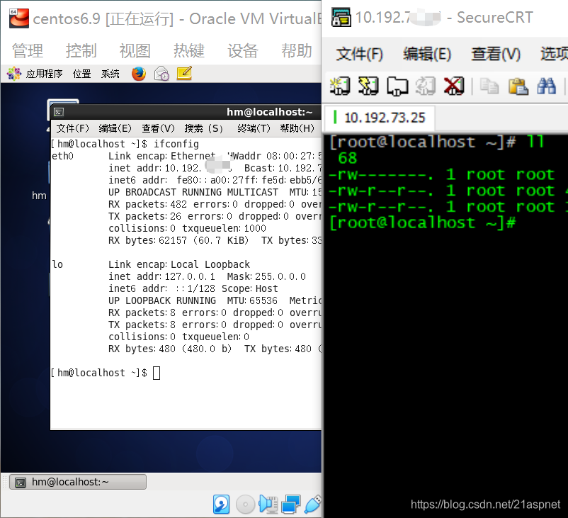 然后进入CentOS看本机IP,可以用SecureCRT连上了: