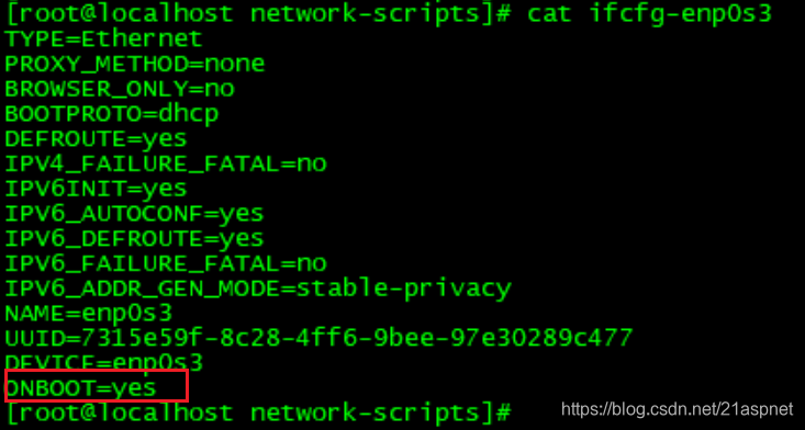 2.找到"ONBOOT=no"这行,将no改为yes。保存并退出。