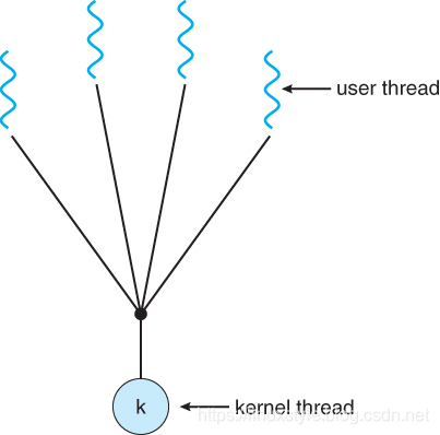 在多对一模型中,许多用户级线程都映射到单个内核线程。