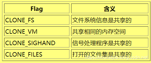 另一个系统调用clone()允许父和子任务之间的不同程度的共享,由下表中显示的Flag控制: