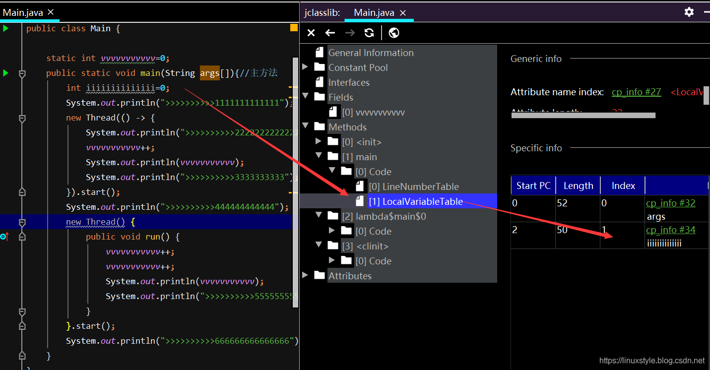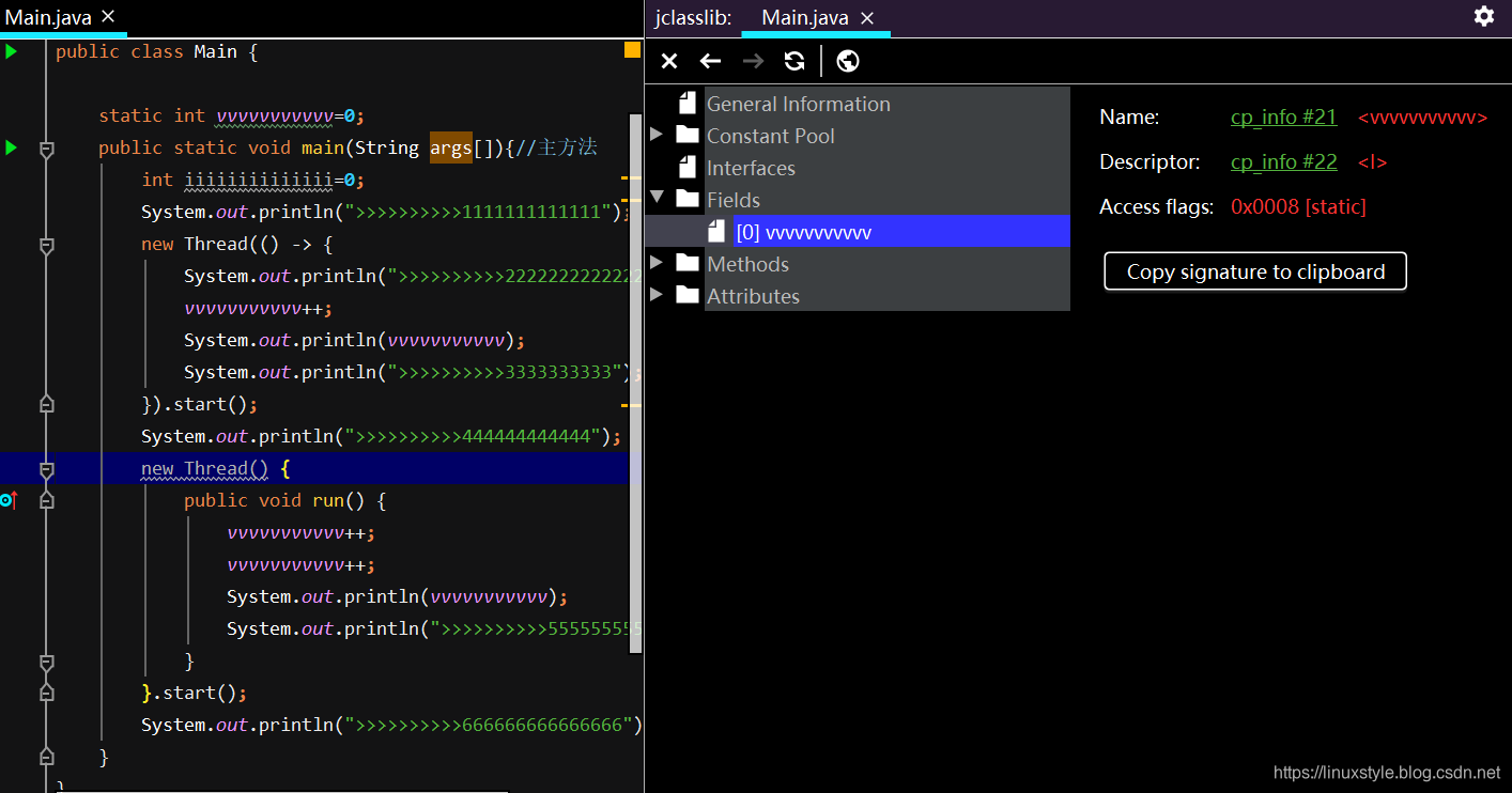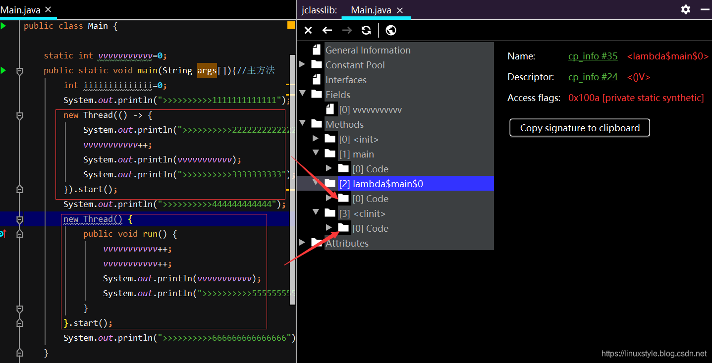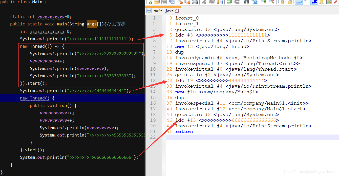 public class com/company/Main {// compiled from: Main.java// access flags 0x8static INNERCLASS com/company/Main$1 null null// access flags 0x19public final static INNERCLASS java/lang/invoke/MethodHandles$Lookup java/lang/invoke/MethodHandles Lookup// access flags 0x8static I vvvvvvvvvvv// access flags 0x1public <init>()VL0LINENUMBER 3 L0ALOAD 0INVOKESPECIAL java/lang/Object.<init> ()VRETURNL1LOCALVARIABLE this Lcom/company/Main; L0 L1 0MAXSTACK = 1MAXLOCALS = 1// access flags 0x9public static main([Ljava/lang/String;)VL0LINENUMBER 7 L0ICONST_0ISTORE 1L1LINENUMBER 8 L1GETSTATIC java/lang/System.out : Ljava/io/PrintStream;LDC ">>>>>>>>>>1111111111111"INVOKEVIRTUAL java/io/PrintStream.println (Ljava/lang/String;)VL2LINENUMBER 9 L2NEW java/lang/ThreadDUPINVOKEDYNAMIC run()Ljava/lang/Runnable; [// handle kind 0x6 : INVOKESTATICjava/lang/invoke/LambdaMetafactory.metafactory(Ljava/lang/invoke/MethodHandles$Lookup;Ljava/lang/String;Ljava/lang/invoke/MethodType;Ljava/lang/invoke/MethodType;Ljava/lang/invoke/MethodHandle;Ljava/lang/invoke/MethodType;)Ljava/lang/invoke/CallSite;// arguments:()V, // handle kind 0x6 : INVOKESTATICcom/company/Main.lambda$main$0()V, ()V]INVOKESPECIAL java/lang/Thread.<init> (Ljava/lang/Runnable;)VL3LINENUMBER 14 L3INVOKEVIRTUAL java/lang/Thread.start ()VL4LINENUMBER 15 L4GETSTATIC java/lang/System.out : Ljava/io/PrintStream;LDC ">>>>>>>>>>444444444444"INVOKEVIRTUAL java/io/PrintStream.println (Ljava/lang/String;)VL5LINENUMBER 16 L5NEW com/company/Main$1DUPINVOKESPECIAL com/company/Main$1.<init> ()VL6LINENUMBER 23 L6INVOKEVIRTUAL com/company/Main$1.start ()VL7LINENUMBER 24 L7GETSTATIC java/lang/System.out : Ljava/io/PrintStream;LDC ">>>>>>>>>>666666666666666"INVOKEVIRTUAL java/io/PrintStream.println (Ljava/lang/String;)VL8LINENUMBER 25 L8RETURNL9LOCALVARIABLE args [Ljava/lang/String; L0 L9 0LOCALVARIABLE iiiiiiiiiiiiii I L1 L9 1MAXSTACK = 3MAXLOCALS = 2// access flags 0x100Aprivate static synthetic lambda$main$0()VL0LINENUMBER 10 L0GETSTATIC java/lang/System.out : Ljava/io/PrintStream;LDC ">>>>>>>>>>22222222222222"INVOKEVIRTUAL java/io/PrintStream.println (Ljava/lang/String;)VL1LINENUMBER 11 L1GETSTATIC com/company/Main.vvvvvvvvvvv : IICONST_1IADDPUTSTATIC com/company/Main.vvvvvvvvvvv : IL2LINENUMBER 12 L2GETSTATIC java/lang/System.out : Ljava/io/PrintStream;GETSTATIC com/company/Main.vvvvvvvvvvv : IINVOKEVIRTUAL java/io/PrintStream.println (I)VL3LINENUMBER 13 L3GETSTATIC java/lang/System.out : Ljava/io/PrintStream;LDC ">>>>>>>>>>3333333333"INVOKEVIRTUAL java/io/PrintStream.println (Ljava/lang/String;)VL4LINENUMBER 14 L4RETURNMAXSTACK = 2MAXLOCALS = 0// access flags 0x8static <clinit>()VL0LINENUMBER 5 L0ICONST_0PUTSTATIC com/company/Main.vvvvvvvvvvv : IRETURNMAXSTACK = 1MAXLOCALS = 0