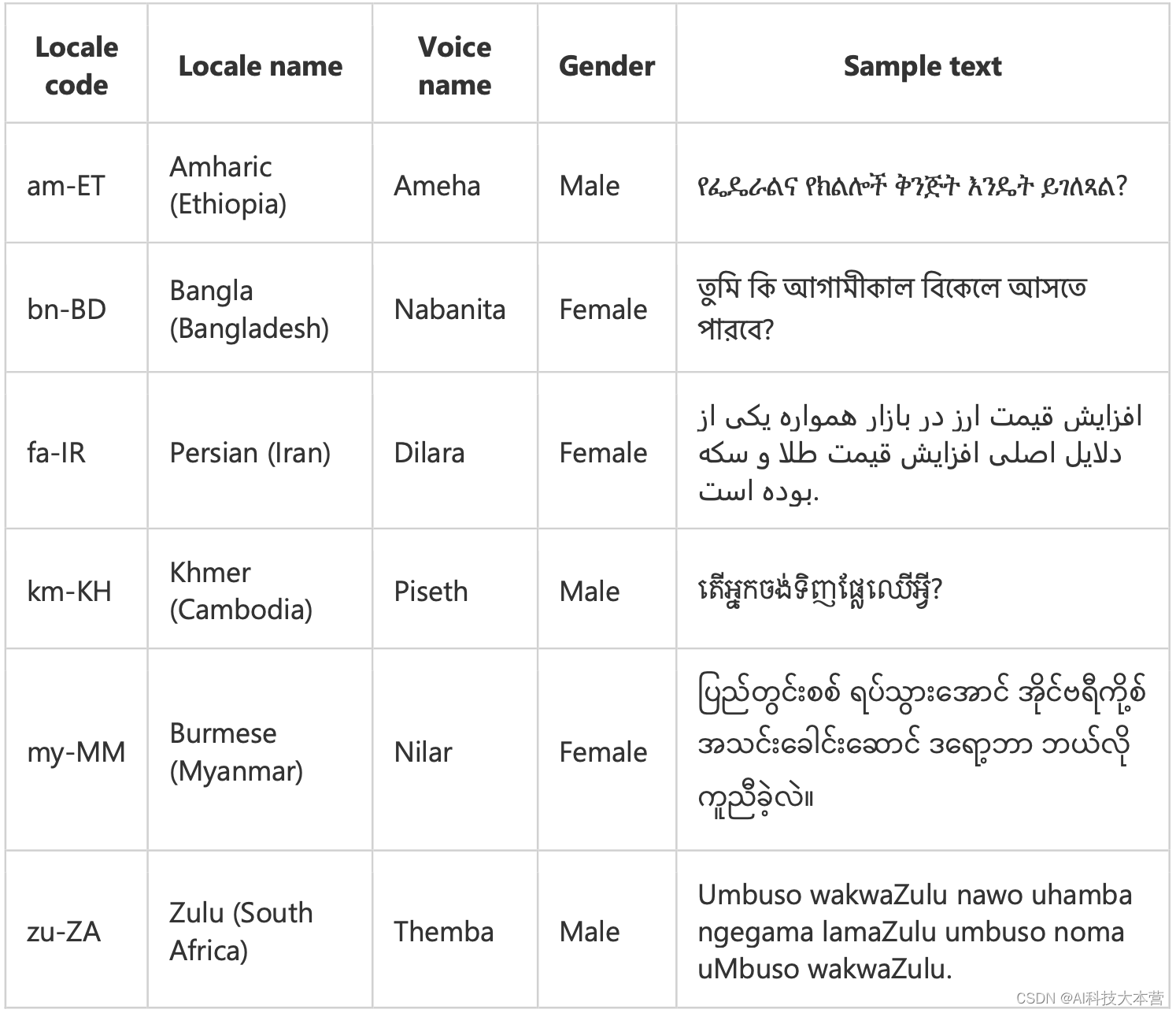 Azure Neural TTS此次更新的64种语言和口音中,既有2亿人使用的孟加拉语、1亿人使用的波斯语、6000万人使用的爪哇语等语言,也有少数人使用的语言,如高棉语、祖鲁语、普什图语、冰岛语等。