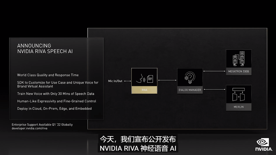 在 GTC 大会上,NVIDIA 推出了为训练具有数万亿参数的语言模型而优化的 NVIDIA NeMo Megatron 框架、为新领域和语言进行训练的可定制大型语言模型(LLM)Megatron 530B 以及具有多 GPU、多节点分布式推理功能的 NVIDIA Triton 推理服务器。