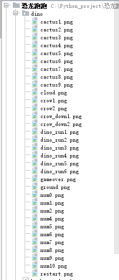 首先我们准备下游戏所需的素材,比如恐龙图片,仙人掌图片,天空,地面等等,我们统一放到 dino 文件夹下