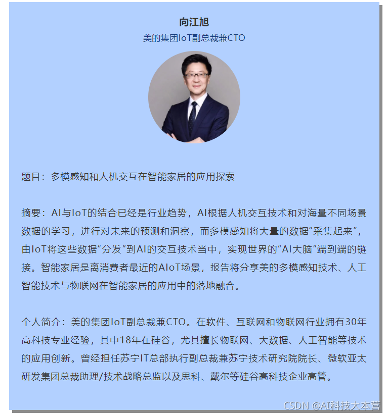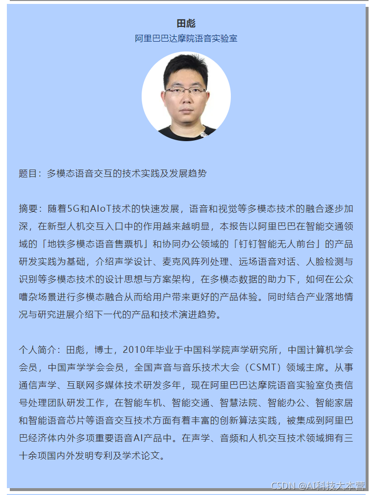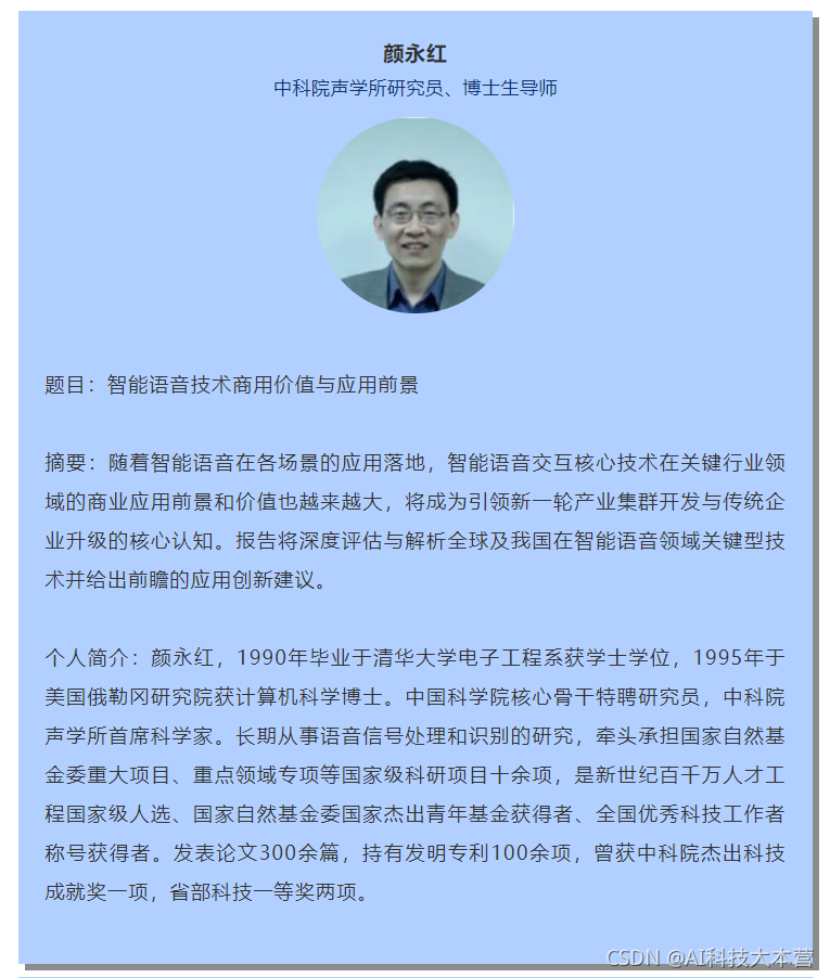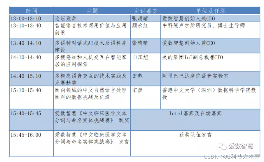参与论坛报告嘉宾分别为:中科院声学所研究员、博士生导师颜永红;爱数智慧创始人兼CEO张晴晴;美的集团IoT副总裁兼CTO向江旭;阿里巴巴达摩院语音实验室田彪、香港中文大学(深圳)数据科学学院教授宋彦。