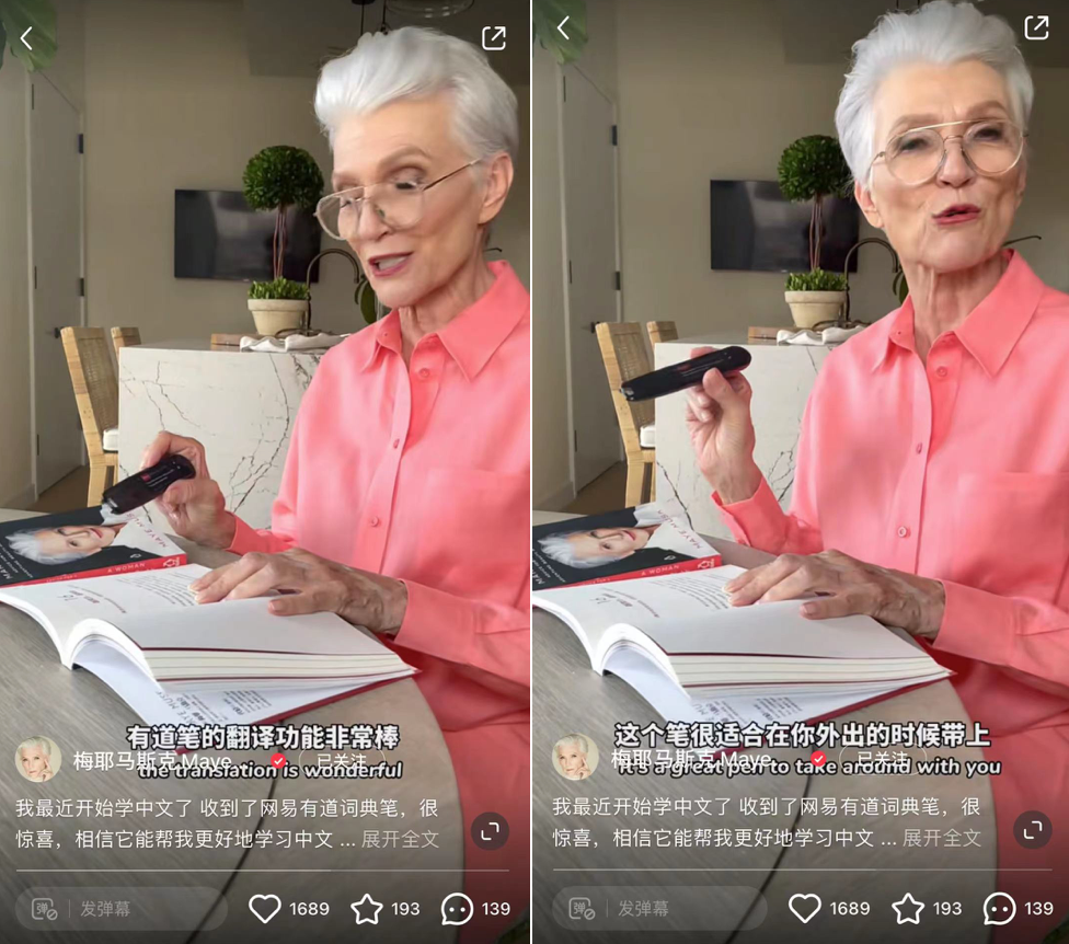 近日,埃隆·马斯克的母亲——梅耶·马斯克使用有道词典笔学习中文的小红书视频,一经发布便引发大量关注,这是这位73岁的“网红”妈妈首次在社交平台使用并推荐中国黑科技产品。