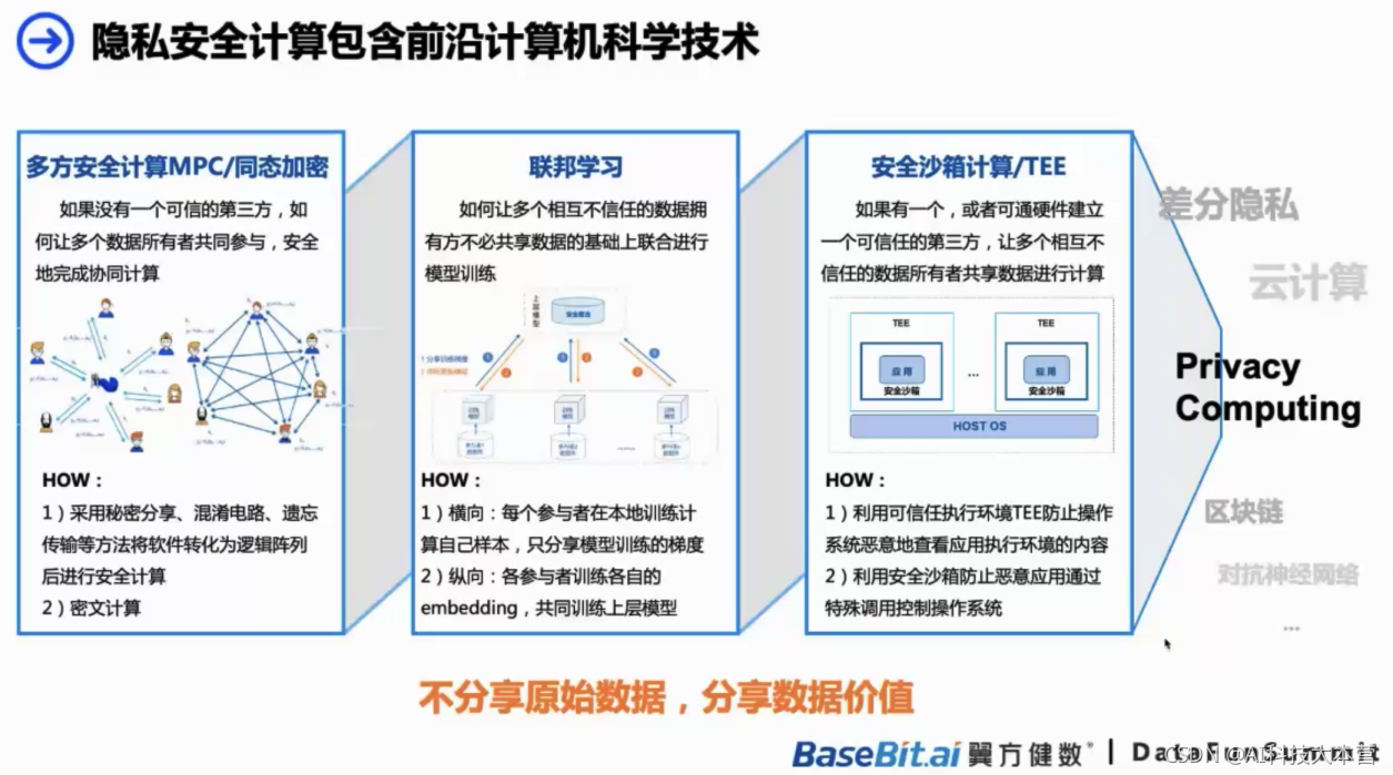 通过隐私安全计算方式,包括多方安全计算MPC/同态加密、联邦学习、安全沙箱计算/TEE等技术,可以实现让原始数据不离开数据平台,数据在平台内授权使用,平台只输出数据价值。