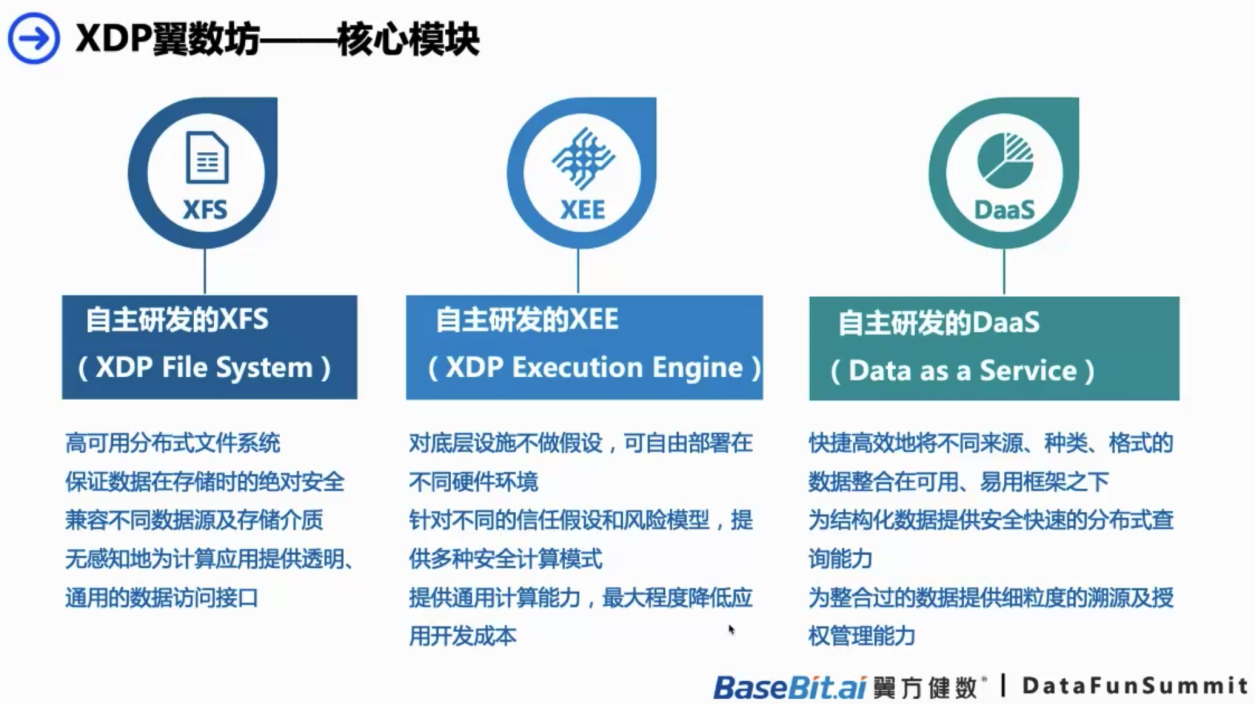 翼数坊XDP平台通过三个翼方健数自主研发的核心模块XFS (XDP File System)、XEE (XDP Execution Engine) 以及DaaS (Data as a Service)兼顾了“安全”与“开放”,实现数据的隐私保护与安全共享。