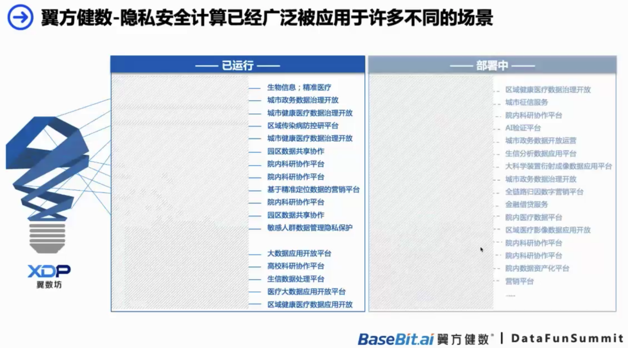 他所重点介绍的翼数坊XDP是翼方健数自研的融合了多种技术的平台产品。作为一个单体平台,它可以通过专属的高效私有协议实现一个联盟,进而实现很多数据平台达成一种共同协议,在数据平台之间,即使没有信任,也能在获取授权的情况下参与共同计算。它能够解决数据开放共享和数据隐私安全保护之间的困境,最终以智能服务等方式输出数据的“价值”。