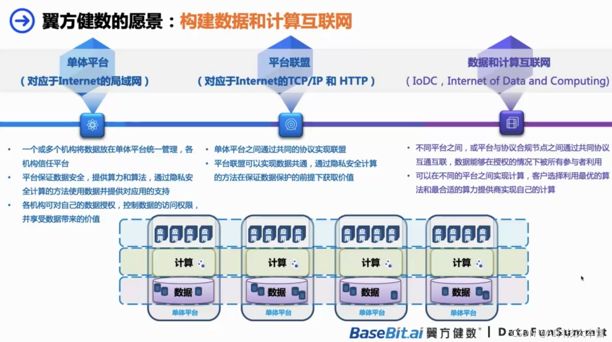 · 长远来看,翼方健数的平台还要与其他隐私计算技术支持的平台进行互联互通。也就是通过数据和算法互联网完成数据互联,通过计算的方式实现数据价值的流通。