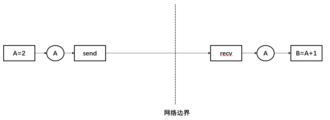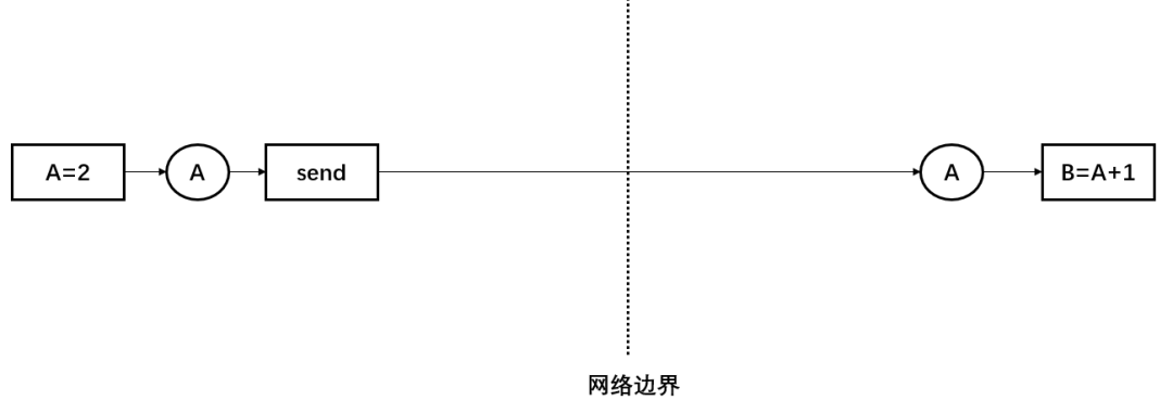 图中虚线表示机器之间的边界,{A=2}在左半部分的机器上执行,{B=A+1}在右半部分的机器上执行,左边的机器生产了A之后,需要被搬运到右边的机器上才能被消费。