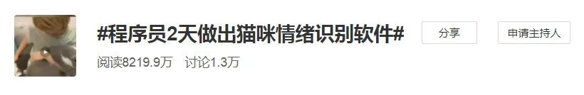 9月1日,一则关于#程序员2天做出猫咪情绪识别软件#的话题登上微博热搜,参与阅读的人数达到了8218.1万,讨论次数1.3万,引发网友们的热议。