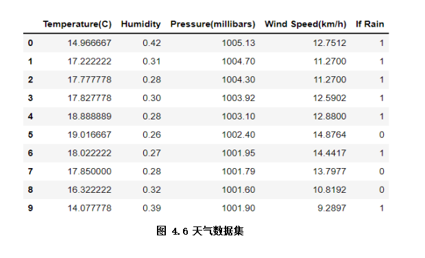 示例所用天气数据集是简单的天气情况记录数据,包括室外温湿度、风速、是否下雨等,在分类任务中,我们以是否下雨作为标签,其他为特征(如图4.6)