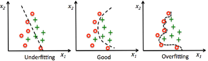 描述模型拟合(学习)程度常用欠拟合、拟合良好、过拟合,我们可以通过训练误差及测试误差评估模型的拟合程度。从整体训练过程来看,欠拟合时训练误差和测试误差均较高,随着训练时间及模型复杂度的增加而下降。在到达一个拟合最优的临界点之后,训练误差下降,测试误差上升,这个时候就进入了过拟合区域。
