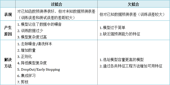 欠拟合是指相较于数据而言模型结构过于简单,以至于无法学习到数据中的规律。过拟合是指模型只过分地匹配训练数据集,以至于对新数据无良好地拟合及预测。其本质是较复杂模型从训练数据中学习到了统计噪声导致的。分析模型拟合效果并对模型进行优化,常用的方法有: