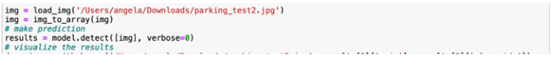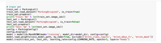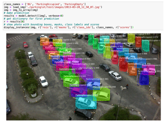 首先我使用Mask-RCNN模型来检测车位上的车辆,并给定可用车位的数量来计算空车位。我们的模型不需要所有的COCO类,所以我将类限制为汽车、卡车和摩托车。但是预先训练的COCO数据集模型在检测小物体方面做得并不好,即使我尝试调整阈值和边界框,那些被误分类为火车的汽车也没有被检测到。这里绘制的是边界框,而不是可视化方法提供的模型。