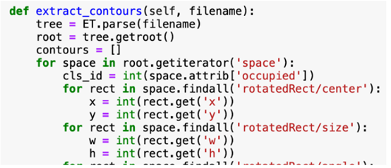 我们必须创建一个类ParkingLot来加载数据集,通过解析带注释的xml文件提取边界框的轮廓。