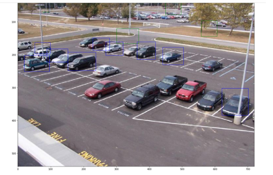 因此,如果我们加载任意随机图像,检测可用和已占用的停车位,使用我们的函数来绘制它们,结果将是: