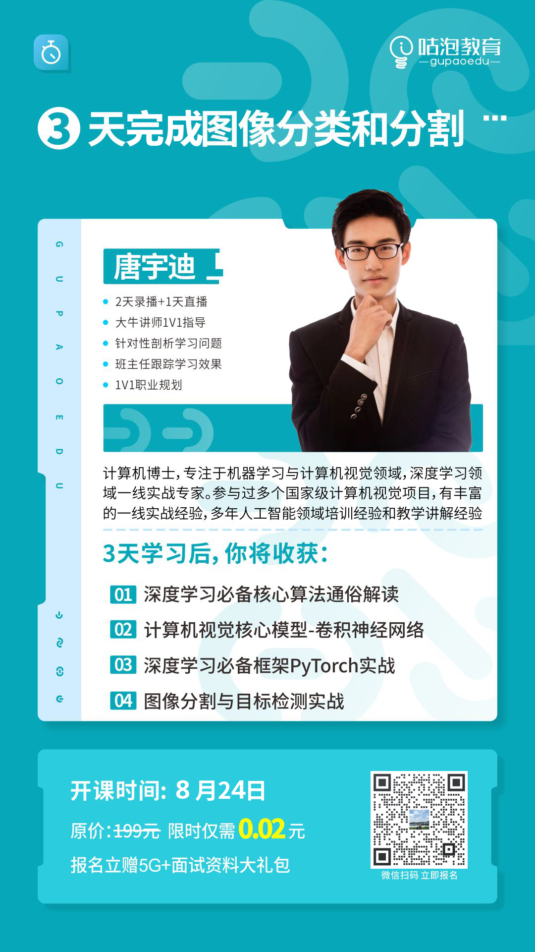 那么为了让大家更好地掌握 图像分类和分割 ,邀请人工智能实战专家唐宇迪博士。专为深度学习的同学开设了『图像分类与分割』特训营。帮助学习背后根本原理和调试代码程序的方式与思路,提升解决实际问题的能力。