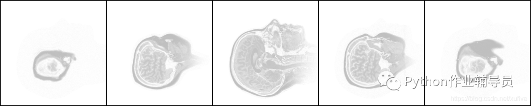 我手头这套头部CT断层扫描片共有109张,是侧卧位的水平断层扫描,从一侧开始至另一侧结束。下图从左至右分别是第11张、第21张、第55张、第89张、第99张。不难看出,中间的一张面积最大,是鼻梁正中的断层图片,鼻尖朝向图片上方,越往两侧的图片,面积越小。