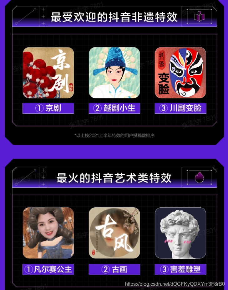文艺类特效同样受到抖音用户的青睐,经典文化艺术以生动有趣的方式为更多人认知。报告称,京剧、越剧小生和川剧变脸是今年投稿数最多的非遗文化类特效,凡尔赛公主、古画和害羞雕塑则在艺术类特效中排名前三。
