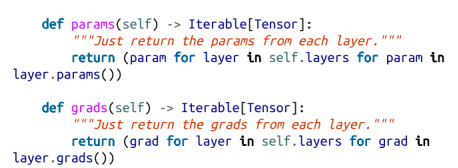唯一令人惊讶的是“切片分配”,这反映了重新分配列表不会改变其原始值的事实。也就是说,如果你只是计算了param=tensor_combine(……),你将重新定义局部变量param,但你不会影响存储在神经网络层中的原始参数张量。但是,如果你给slice[:]赋值,它实际上会更改列表中的值。