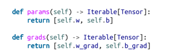 最后,在这里,我们确实需要实现params和grads。我们有两个参数和两个相应的梯度: