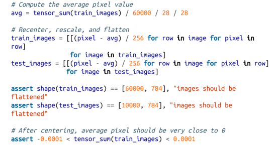 每张图像为28×28像素,但我们的线性层只能处理一维输入,因此我们将使它们变平(并除以256以使它们在0和1之间)。此外,如果我们的输入平均为0,神经网络训练更好,因此我们将减去平均值: