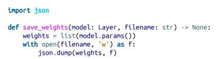 为了保存,我们可以使用Layer.params来收集权重,将它们粘贴在一个列表中,并使用json.dump将该列表保存到一个文件中: