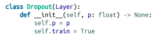 在评估时,我们不想dropout任何神经元,所以dropout层需要知道它是否在训练。此外,在训练时,dropout层只传递其输入的一些随机部分。为了使其输出在评估期间可比较,我们将使用相同比例(均匀)缩小输出: