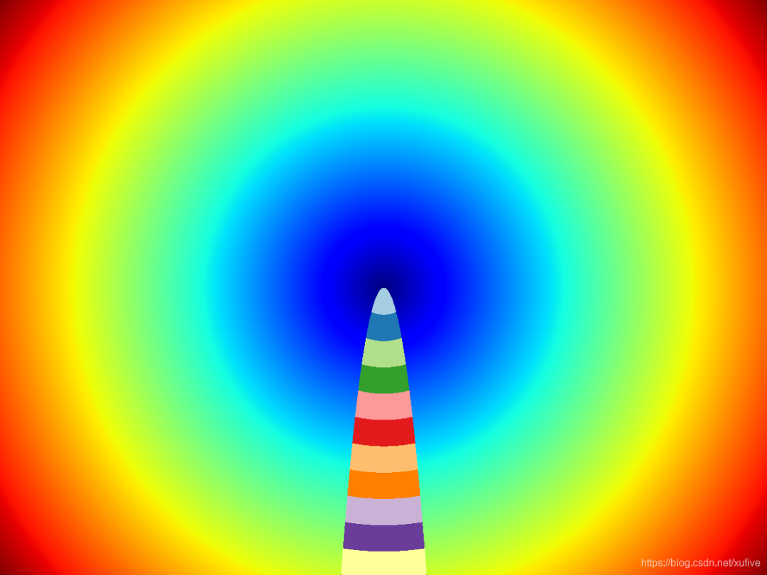 >>> def draw_picture(w, h, cm1='jet', cm2='Paired'):cm1, cm2 = mplcm.get_cmap(cm1), mplcm.get_cmap(cm2)colormap1, colormap2 = np.array([cm1(k) for k in range(cm1.N)]), np.array([cm2(k) for k in range(cm2.N)])i, j = np.repeat(np.arange(h),w).reshape(h,w)-h//2, np.tile(np.arange(w), (h,1))-w//2d = np.hypot(i, j)e = d[(j*j/10)<i]d = np.int32((cm1.N-1)*(d-d.min())/(d.max()-d.min()))d = np.uint8(255*colormap1[d])e = np.int32((cm2.N-1)*(e-e.min())/(e.max()-e.min()))d[(j*j/10)<i] = np.uint8(255*colormap2[e])Image.fromarray(d).show()>>> draw_picture(1200, 900, cm1='jet', cm2='Paired')