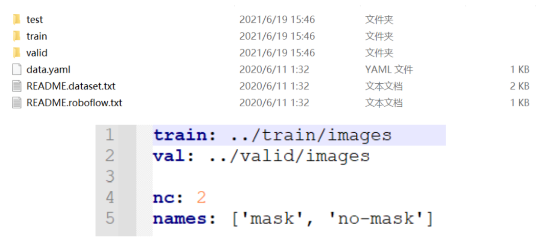 比如Mask Wearing数据集只有两种类别:mask和no-mask,所以nc = 2。可见data.yaml中的信息:
