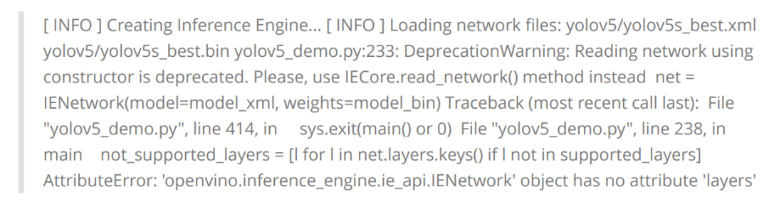def scale_bbox(x, y, height, width, class_id, confidence, im_h, im_w,resized_im_h=640, resized_im_w=640):gain = min(resized_im_w / im_w, resized_im_h / im_h) # gain = old / newpad = (resized_im_w - im_w * gain) / 2, (resized_im_h - im_h * gain) / 2 # wh paddingx = int((x - pad[0])/gain)y = int((y - pad[1])/gain)w = int(width/gain)h = int(height/gain)xmin = max(0, int(x - w / 2))ymin = max(0, int(y - h / 2))xmax = min(im_w, int(xmin + w))ymax = min(im_h, int(ymin + h))# Method item() used here to convert NumPy types to native types for compatibility with functions, which don't# support Numpy types (e.g., cv2.rectangle doesn't support int64 in color parameter)return dict(xmin=xmin, xmax=xmax, ymin=ymin, ymax=ymax,class_id=class_id.item(), confidence=confidence.item())但在实际测试中,会出现:'openvino.inference_engine.ie_api.IENetwork' object has no attribute 'layers' 问题:
